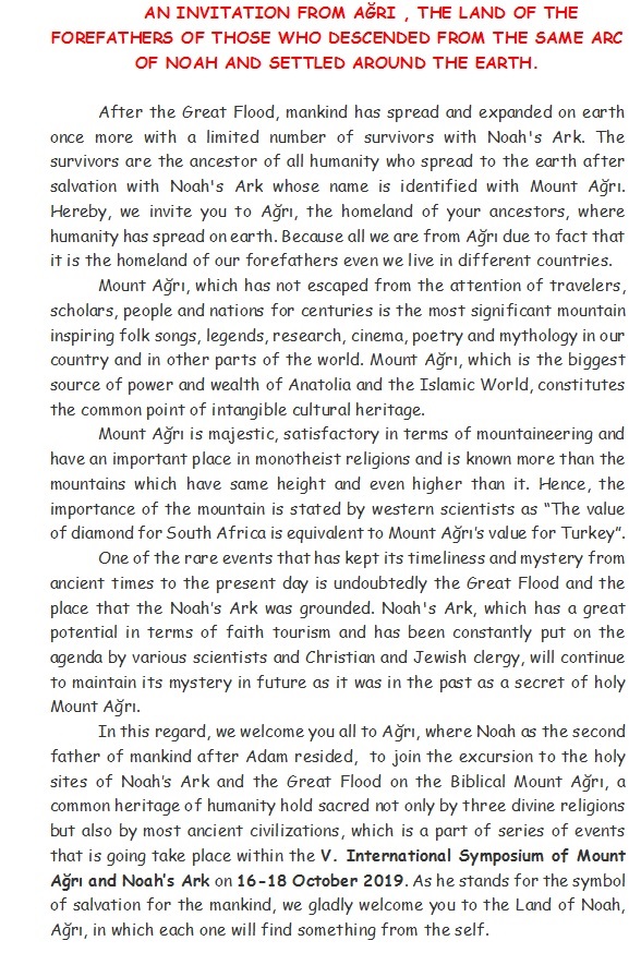 V. International Symposium of Mount Ağrı and Noah’s Ark will be held at Culture and Congress Center of Ağrı İbrahim Çeçen University on 16-18 October 2019.
